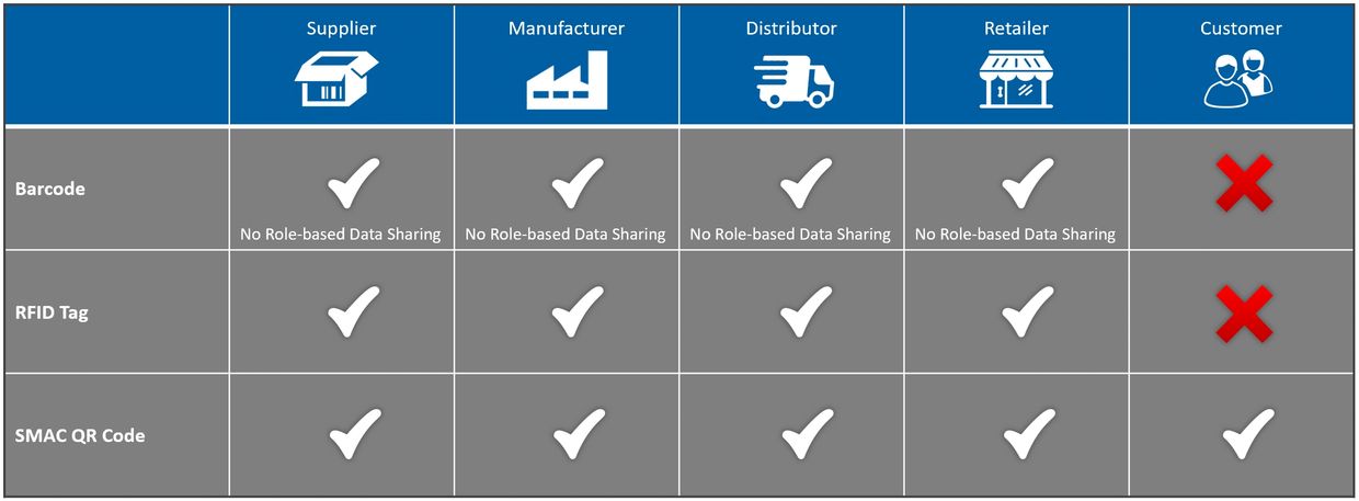 The SMAC QR Code is very accessible and can be read by inventory management readers or simple smartphones. With SMAC, there is an added layer of security and ability to secure data access via roles-based data sharing